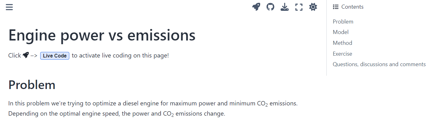 As can be seen on the right-hand-side menu, the sub-chapter includes the problem statement, the elaboration on the model and solution method and finally an exercise for the student. The code in the page is activated by pressing the live code button which will make the code cells editable and executable. Additionally, interactive figures are included into the text with movable sliders to directly see the effect of the changes made.