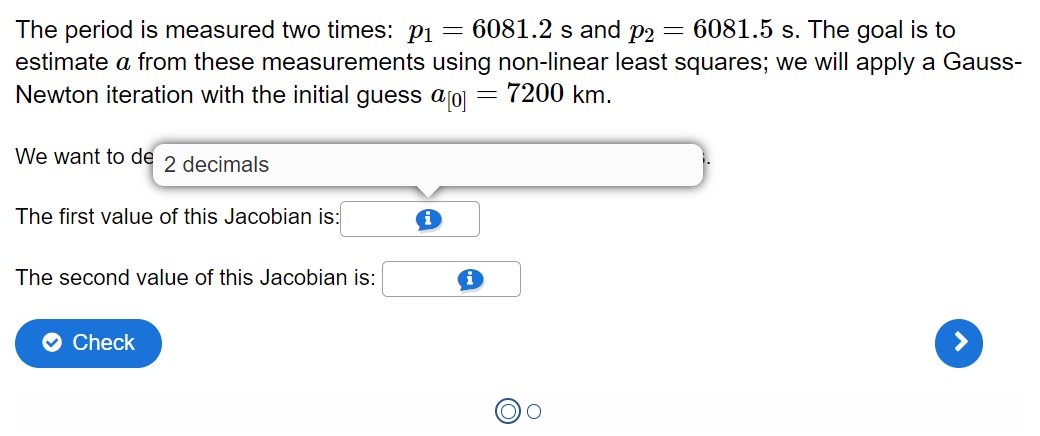 Chapter 3.7. Non-linear least-squares estimation from the MUDE 23/24 book makes use of the complex fill in the blanks quiz in order to check that the students understood the composition of the Jacobian Matrix specifically used in deriving the linearized functional model. This model is essential for accurately estimating values and assessing system behavior of complex processes that arent linear.