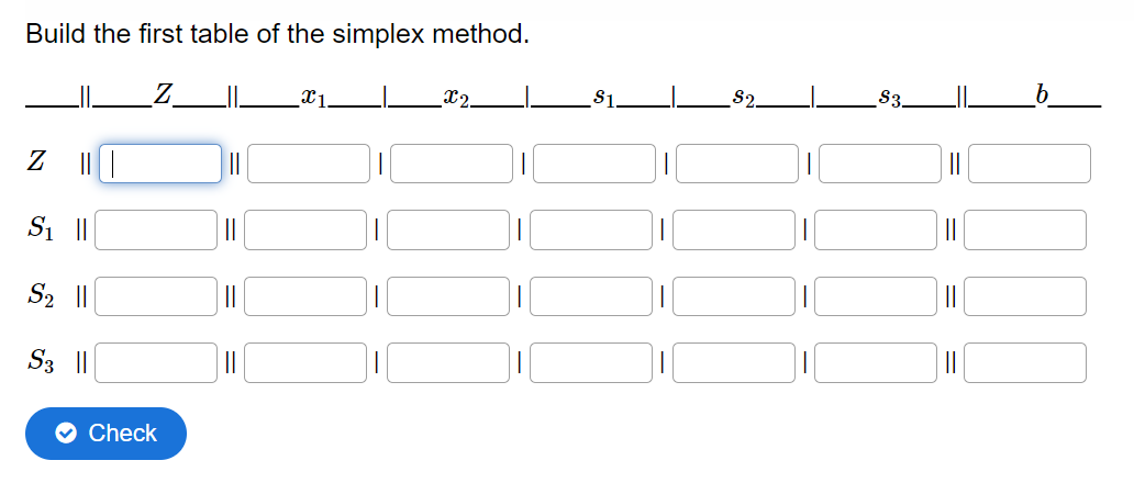 Since the cells can be used to evaluate numerical answers, they are an easy way to quiz the student on matrices and evaluate the result of each position indidependently. The optimization team of MUDE took this a step further and used this set-up to quiz the students on the SIMPLEX method. This method automates the solving of the augmented form of a linear programing problem with continuous variables. It makes use of tables and the manipulation of equations to find the optimal vaues. Unfortunately, with a large number of variables this tables tend to get quite big and filling in the cells becomes laborous.