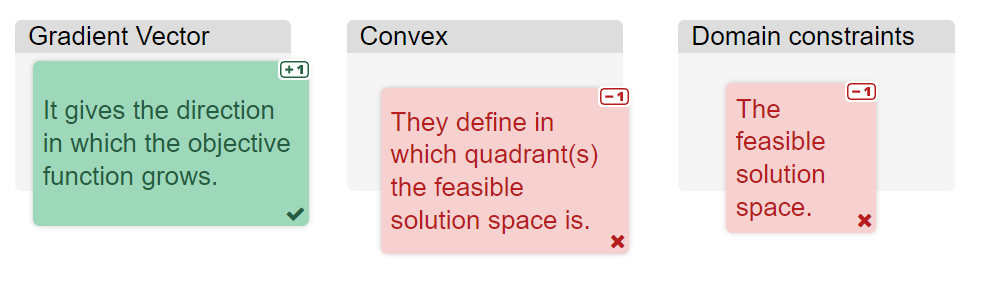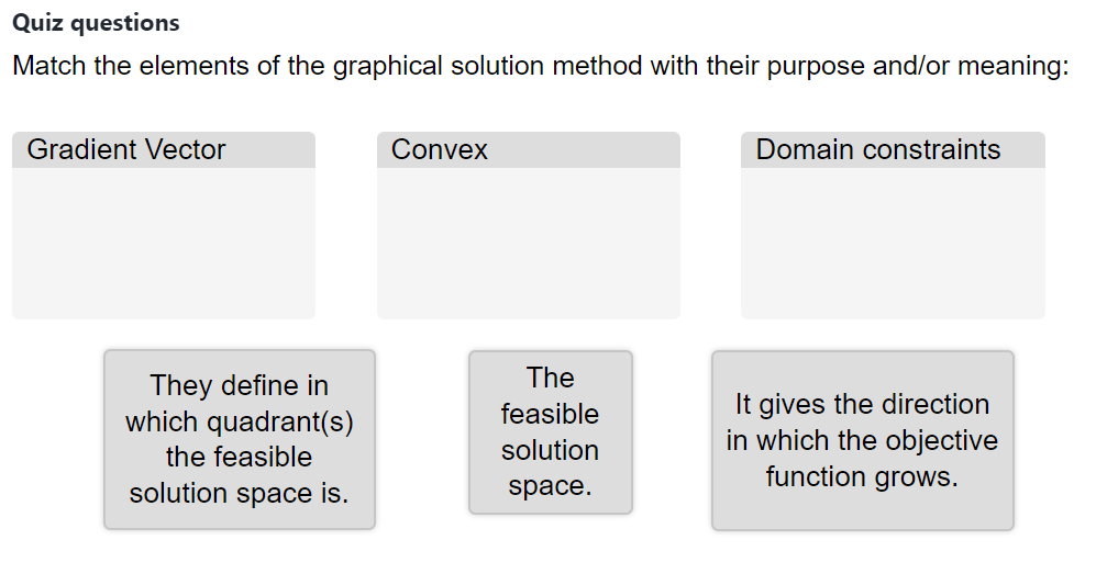 In this chapter, it was important that the students made the distinction between the terminology and mathematical meaning between different elements of the graphical solution method. A drag and drop question was used to link the term to its definition. The answer boxes can be dragged to the correct title in a playful manner.jup